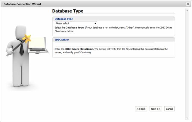 All Database Connections require a JDBC driver and this must be added to the server system before the connection can be used. For the supplied Tomcat system, the driver file (usually a jar or zip file) should be added to userdata/tomcat/lib. A restart of the server is required. The Database Connection Wizard checks for the existence of the JDBC driver and will prompt you if it’s missing.