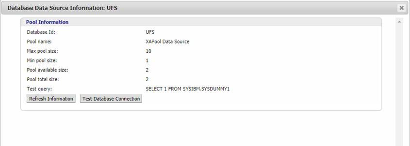 The data source information shows information regarding the database connection pooling and transaction manager. This popup gives a summary of the all the database connections objects in the connection pool.