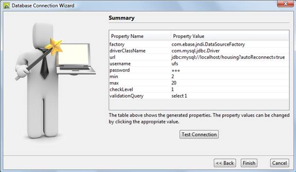 Click Finish to create a Database Connection with these properties.