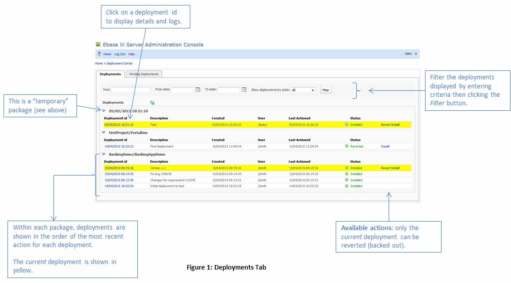 This page shows all inbound deployments into the server system. These inbound deployments are created by developers and are then deployed to a specific server. A developer can choose to make a deployment in one of two ways: