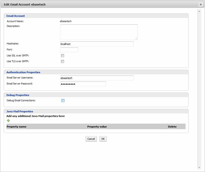The properties that can be configured in the sections above are the email properties most commonly used, however any additional properties supported by the javamail API can also be configured by adding them in this section. The Verj.io email implementation always uses the SMTP protocol so only properties pertaining to this protocol will be effective.