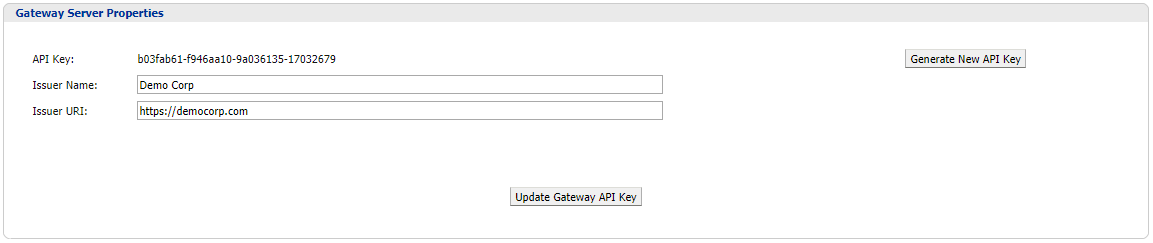 The Gateway Server Properties section contains the Gateway Server API key. This key is used to create the trust relationship between this server acting as a Gateway Server and a Remote Server. It will be copied into the Remote Gateway Server Configuration on the Remote Server.