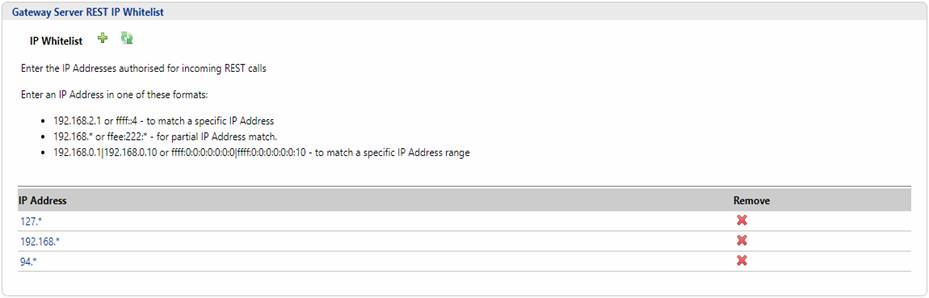 The Gateway Server REST IP Whitelist contains a list of IP addresses that are authorised to invoke a Gateway RESTful Web Service on this server. This list is optional and if configured, the IP addresses are used for authorising all incoming requests.