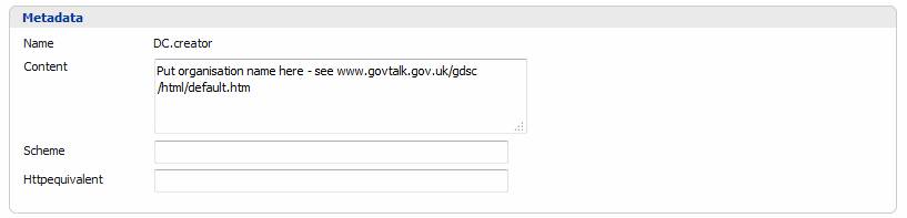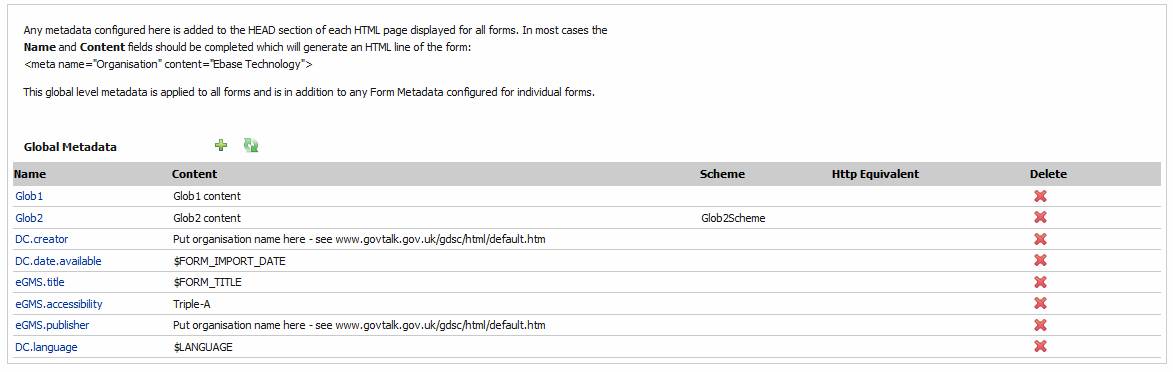 Any metadata configured here is added to the HEADER section of all pages of all forms. Metadata can also be configured at individual form level. Click here for details.