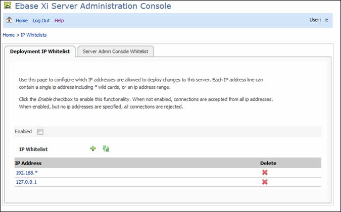 Select the tab for the white list you would like to configure. Filtering of IP addresses is only active when the Enabled checkbox is checked. Note that if Enabled is checked but no IP addresses are provided, access will be denied to all IP addresses.