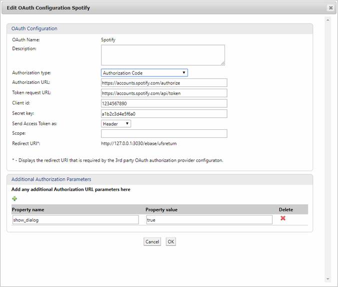 Add additional parameters specific to the Authorization Code type. The parameters are added to the request when calling the authorization URL. These additional parameters can be overridden by entering the values into the Rest Web Service Security dialog or calling the JavaScript method HttpAuthentication.createOAuthAuthentication(name, scope, username, password, additionalParameters).