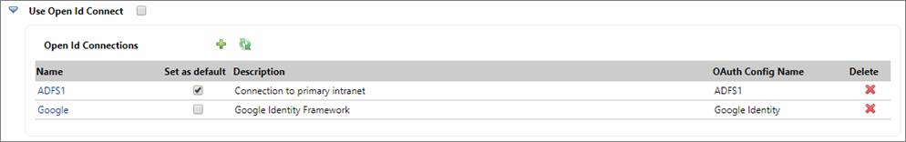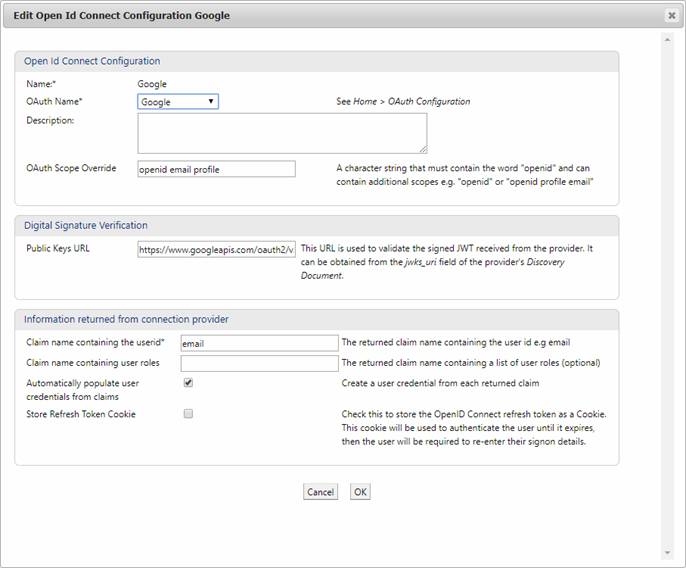 An OpenID Connect configuration represents a connection to a third party OpenID Connect system that provides external authentication e.g. Google Identity Platform, Salesforce, ADFS. The OpenID Connect protocol is an extension of OAuth 2.0 protocol; similarly an OpenID Connect configuration is based on an OAuth Configuration and provides a way of extending this to provide more properties required for OpenID Connect.