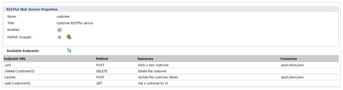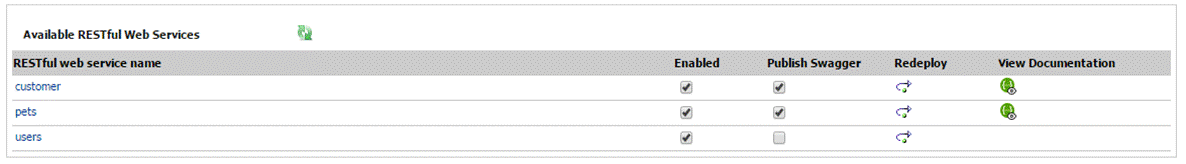 This page provides the ability to control Web Services which are the public interface to RESTful Web Services. All RESTful Web Services in the workspace are shown here.