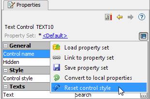 To reset all style for a control, click on the Property Set icon in the Properties View and select Reset control style. This resets all