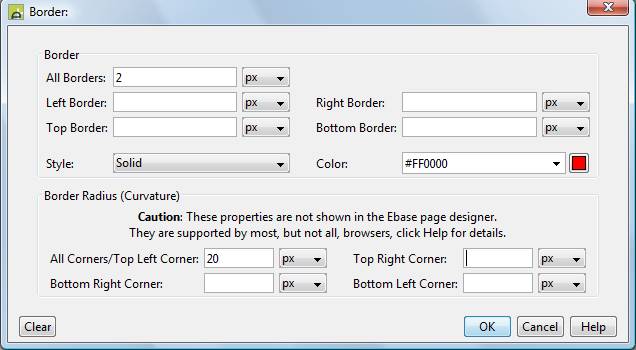 The following border radius properties are not always available. These properties set the degree of curvature for the corners of a border. Curved borders are not currently supported by the Ebase page designer, therefore the affect of the properties is not shown in the designer. The curved borders will however be shown when the form is run in a browser.