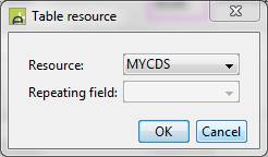 The resource to be used as a backing resource for the table. Double-clicking on this property or clicking the … button presents the dialog below: Resource: is the backing resource for the table. The dropdown list shows all resources in form’s Resources View which support tables, and which are not already used by other tables. A table Database Resource can only be used by one table in the form. A table can only be associated with a single resource. Note that a Database Resource must have option For use with tables operations checked to be included in the list of available resources. Click here for more info. Repeating field: is only applicable for Custom Resources, XML Resources or Web Services Resources; these resources can support multiple tables and this property is used to indicate which table should be used. When the table is part of a deployed component and the resource has been configured in the component, this property cannot be changed and is displayed as read-only. |
