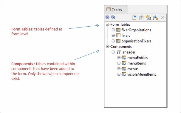 The Tables View shows all the form’s tables. Any tables from components that have been added are shown separately under the Components heading. Opening an individual component shows the name of each table as configured in the source component, moving the mouse over the table name shows the fully prefixed name of that table in the form. The diagram above shows the tables for a form, but the display is very similar for all other entities that can have tables i.e. Components, Rest Services, Integration Services and Workflow Processes; the only difference is that the heading name Form Tables changes.