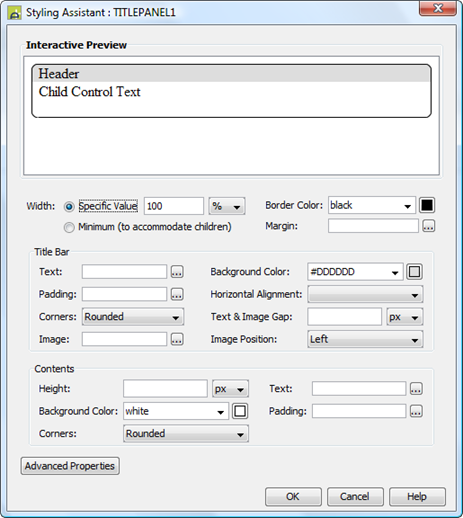Sets the width to one of the following: · A specific value e.g. 300px · The minimum value: this results in the Titled Panel Control being just as wide as it needs to be to accommodate its content Note that this setting will be ignored if the parent container layout specifies a horizontal cell alignment of fill (this applies to Horizontal Box, Vertical Box and Column layouts). This is equivalent to specifying 100% above. Warning: when a specific value is set, any margins will be in addition to the specified value and can cause the Titled Panel Control to “break out” of its parent space. Click here for further info. See also: hints and tips, understanding width. |