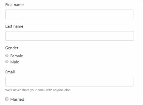 You can achieve a horizontal form layout by using the Bootstrap Field Layout on the parent container control. This layout is responsive and will break to the vertical layout shown above for very small device viewport sizes (the break points can be configured using layout properties). Note that this layout should be used in preference to the legacy Field Grid Layout with Bootstrap because the latter is not responsive.