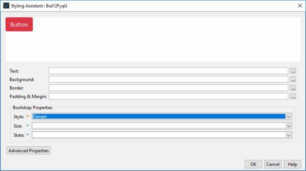 Most Bootstrap styling is implemented by applying CSS classes to the appropriate HTML elements. In addition to the specific items above, you can implement Bootstrap styling by just adding the required classes to the Verj.io controls – most classes have a class property under the Style heading, more complex controls that multiple HTML elements will usually have multiple classes and these can be configured via the controls’ styling assistants (right click on any control, select Style).