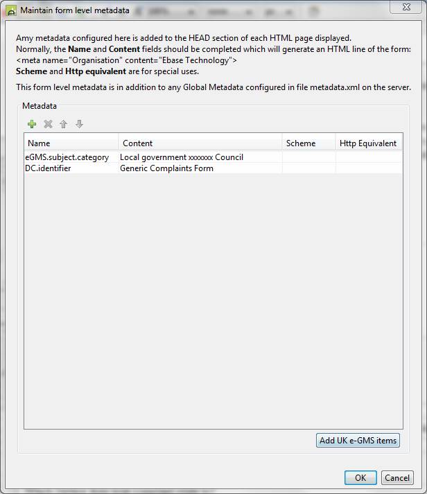 Global metadata is added to the HTML for all forms. It is maintained using the Server Administration Application and is contained within file metadata.xml within the Verj.io configuration area on the server – the default location for this file is <userdata>/apps/<webapp>/ebaseConf/metadata.xml. Here is an example: