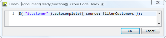 This uses jQuery to find the element with the customer id – the Locator we just added to the input of the Field Control – and calls the jQuery UI autocomplete function on it.