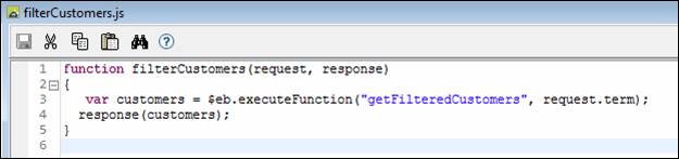 Here we have defined the function filterCustomers which accepts 2 parameters, request and response and use the Client API executeFunction method ($eb.executeFunction) passing in the name of the