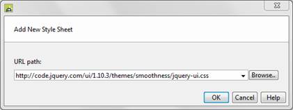 click on the ‘add Stylesheet button (green plus). Enter the URL: http://code.jquery.com/ui/1.10.3/themes/smoothness/jquery-ui.css :