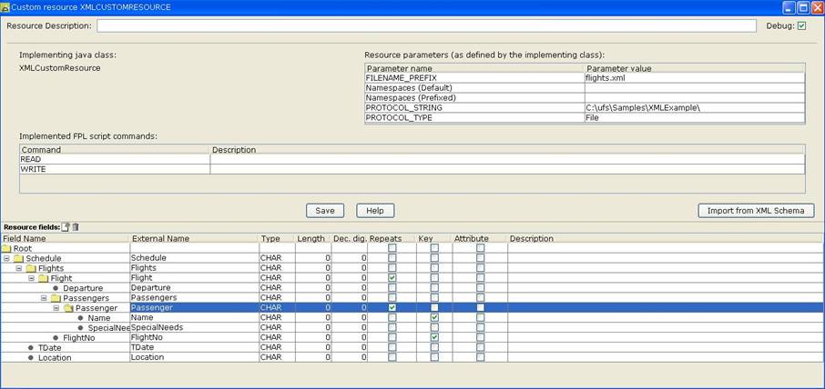 Each XML file has a particular structure (often defined by a DTD or XML Schema) for which a Custom Resource Specification must be created. This section explains how to create and configure the flights.xml example deployed with the Ebase samples. This explains in more detail  the relationship between the Resource Fields and Form Fields which is not described in this document.
