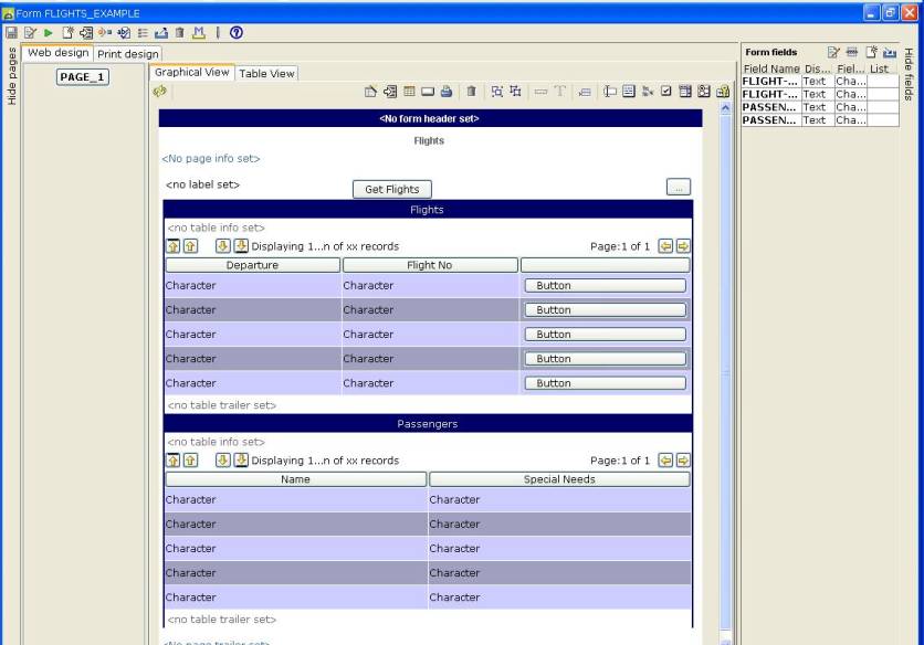 When a form is created, the fields of a resource can be utilised within the form. There is no difference between using a custom resource and using a native Ebase resource (such as a Database resource) when importing or using resource fields in your form. The difference between these two is that the Custom Resource must have a source Java program associated with it which defines what happens when a script command is issued on the resource or a fetchTable or updateTable command is issued against a table. Our form (number 3 above) has two tables which represent a parent-child relationship within the XML flights table.