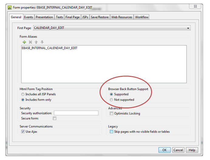 The default for browser back button support is specified in the Form Options tab of Studio Preferences for each studio. If this parameter is not specified, the default is false i.e. back button support is disabled. This default can be overridden at form level with property Browser Back Button Support in the General tab of form properties as shown below.