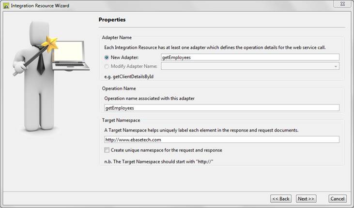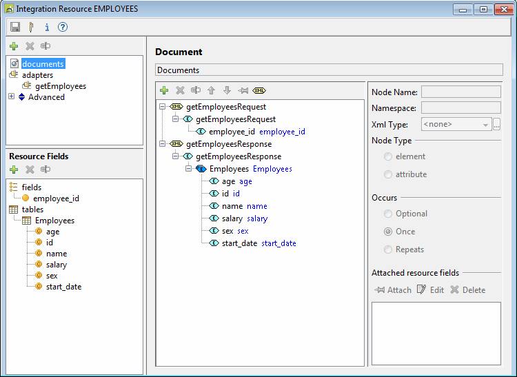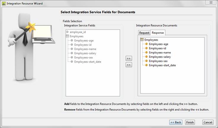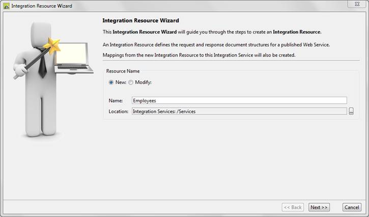The Integration Resource Wizard is invoked by clicking the  icon on the Integration Service toolbar and is used to create an Integration Resource from the fields and tables within an Integration Service.