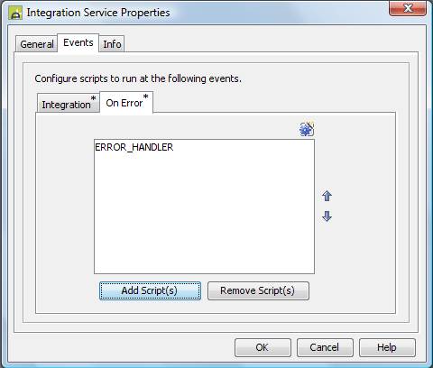 One or more Ebase scripts can be added to an on error event. On error events can be added to the Integration Service through the Integration Service Properties dialog and selecting the Events tab.