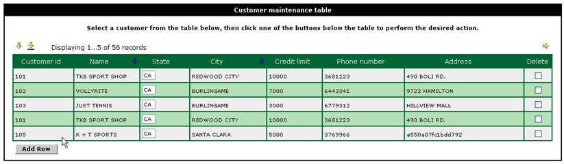 An add row button can be added at the bottom of the table display to allow insertion of rows by end users. This is requested by setting the Show add row button Table Control property. When the add row button is clicked, a new table row is inserted and the add row event is triggered. The add row event is typically used to assign values to columns in the new row.
