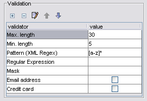 The grid shows both the available and configured validators for this field. In this example, the field has been configured with three validators. The first two ensure that field values contain between 5 and 30 characters. The third is a regular expression restricting field values to alphabetic characters. The value of any validator can be changed by editing the appropriate grid cell.