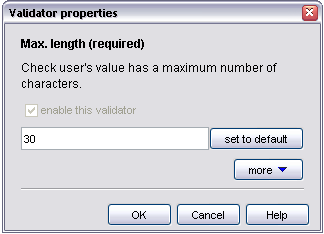 enable this validator - Select the checkbox to enabled this validator. If the validator needs a property value, it should be entered in the field.