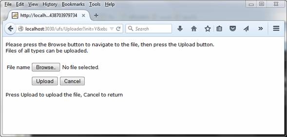 The upload facility is invoked by using the FPL upload command or the API form.uploadFileFromBrowser() method; The FPL upload command takes no additional parameters whereas the API form.uploadFileFromBrowser() method allows specification of upload options where some of the parameters