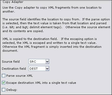 This page describes the adapters supplied with the XML resource and parameters to configure them. The web service adapter is described in a separate document