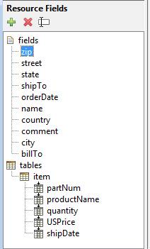 are shown (in blue) next to their owner XML node. Attached resource fields remain attached to
